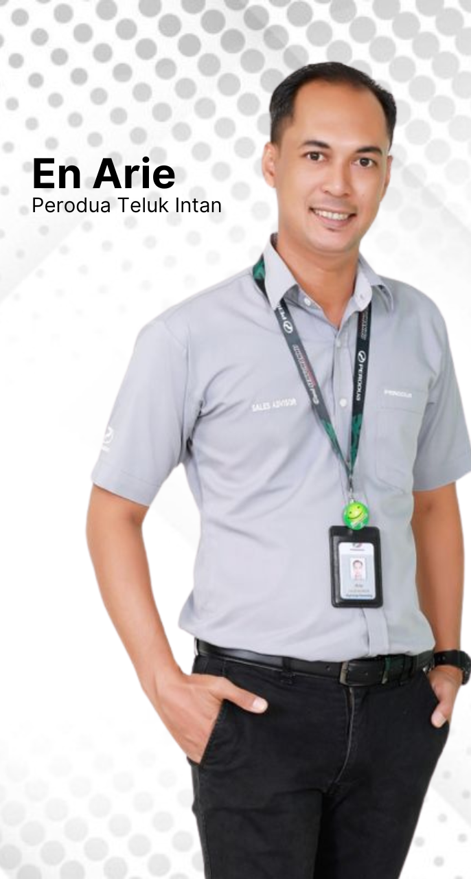 Hi, Selamat datang ke Perodua Teluk Intan. Saya En Arie, Penasihat Jualan Sah Perodua yang berpengalaman lebih 10 tahun di Perodua Teluk Intan.